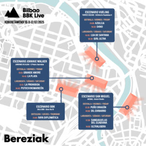 Del 10 al 12 de julio miles de afortunadas y afortunados aficionados a la música disfrutaran de los conciertos del BBK Live en Kobetamendi, pero el ambiente del festival se podrá vivir también en pleno centro de Bilbao y de manera gratuita, con el ciclo BEREZIAK.